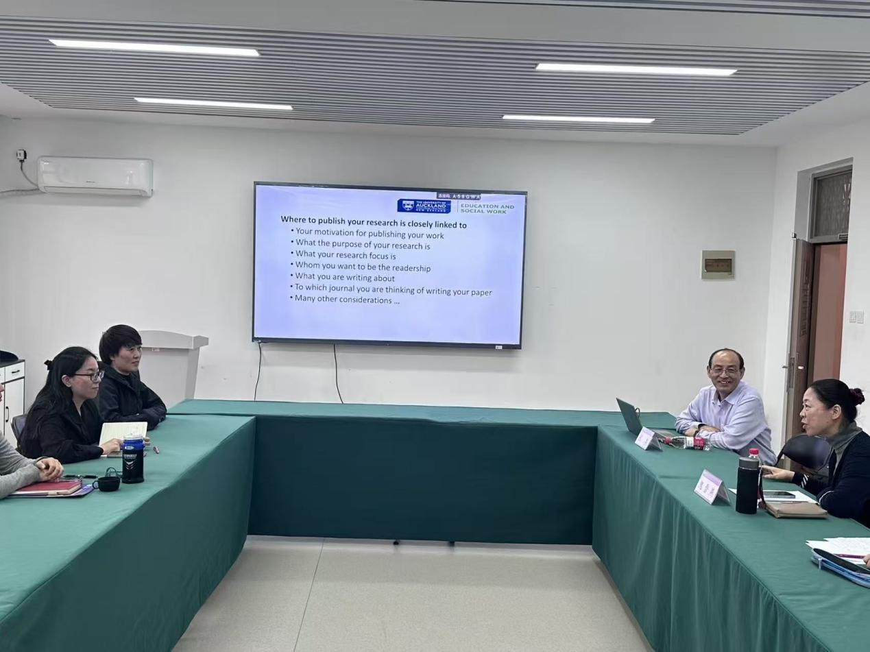 2026年4月14日下午,应外国语学院院长隗雪燕邀请,新西兰奥克兰大学文学艺术及教育学部国际合作副部长张军教授(Lawrence Jun Zhang)在教五楼303会议室作青年教师科研专题讲座,院长隗雪燕教授主持,学院党委书记刘金艳及青年教师代表参加本次学术交流活动。