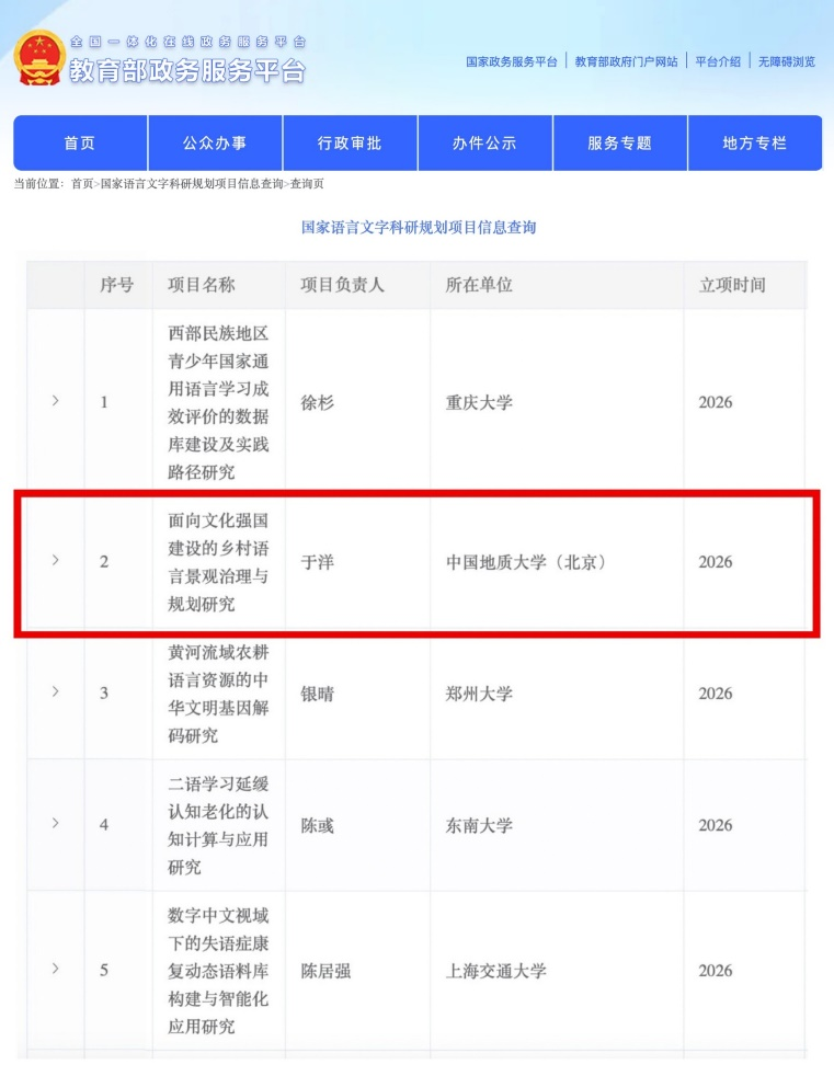 近日,国家语委科研规划领导小组办公室正式发布国家语言文字“十四五”科研规划2025年度项目立项通知。我院于洋副教授申报的“面向文化强国建设的乡村语言景观治理与规划研究”获批一般项目(中青班项目)立项。这是我院首次获批国家语委科研项目,标志着学院在国家语言文字高水平科研领域实现了重要进展。